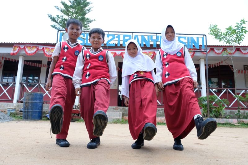 Di luar kelas, empat anak berjejer sambil memeluk kotak hadiah. Ada kebanggaan yang terpancar, seolah sepatu itu adalah hadiah terindah yang pernah mereka terima.