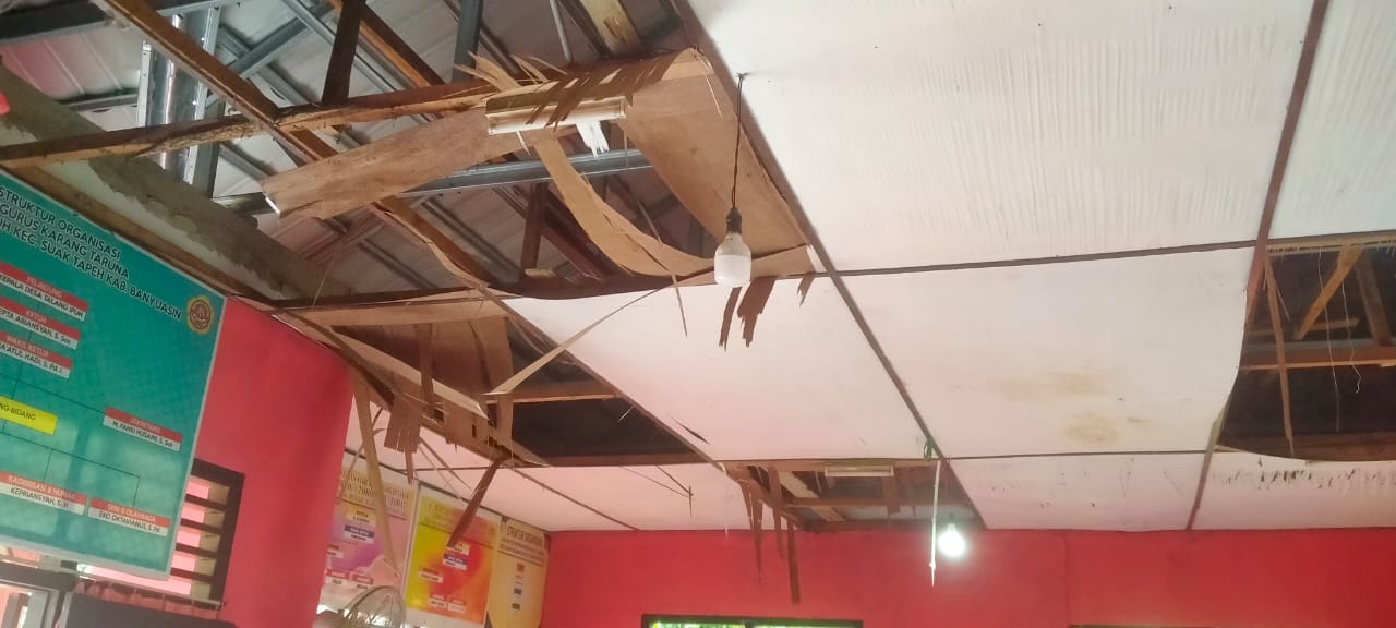 BANYUASIN, inewsnusantara.com,- Bangunan Kantor Desa Talang Ipuh Kecamatan Suak Tapeh Kabupaten Banyuasin, kondisi nya sangat memperihatinkan, plafon dan kaso berikut atapnya bangunan tersebut terlihat hancur dan berjatuhan.