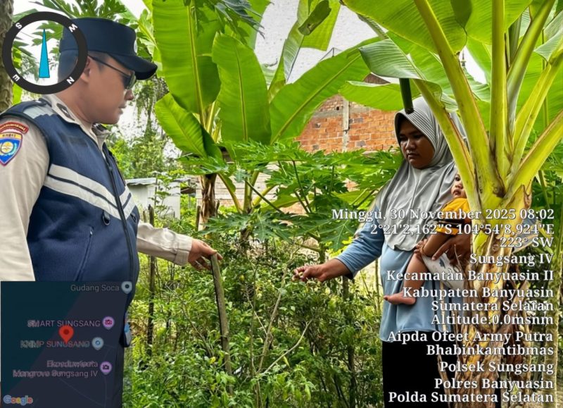 BANYUASIN-INC,-Bhabinkamtibmas Polsek Sungsang, Aipda Ofeet Army Putra, aktif melaksanakan pendekatan dan pembinaan kepada masyarakat dalam mendukung program pemerintah. Kegiatan ini berlangsung di Desa Sungsang IV, Kecamatan Banyuasin III, Minggu (30/11) pukul 13.05 WIB.