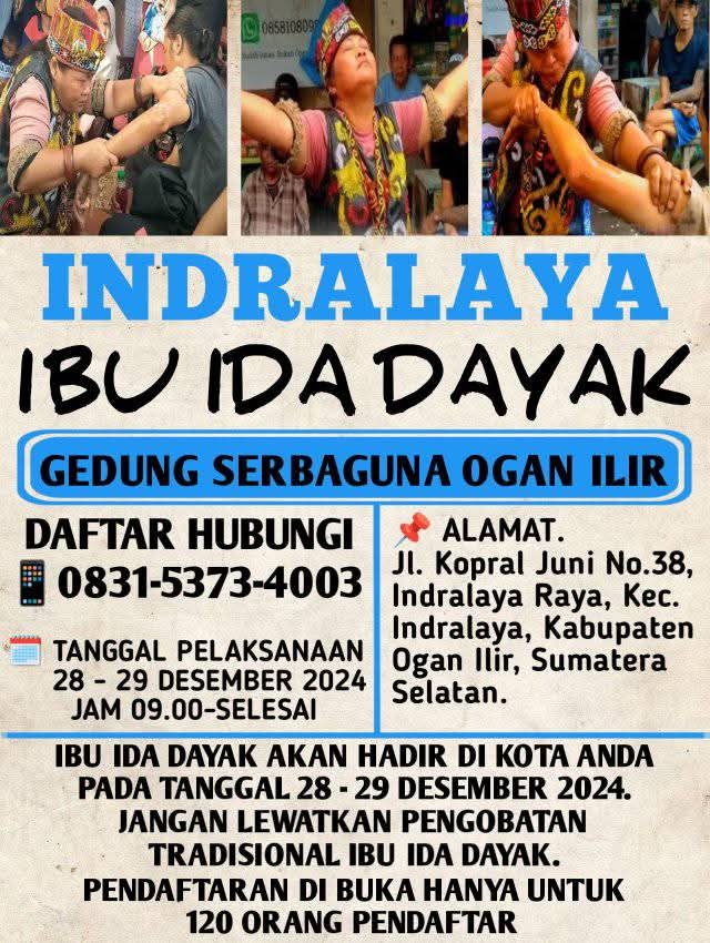 INDERALAYA ,Inewsnusantara com– Beredar di media sosial, Ida Dayak akan datang ke Indralaya, Ogan Ilir, untuk membuka pengobatan gratis bagi masyarakat.