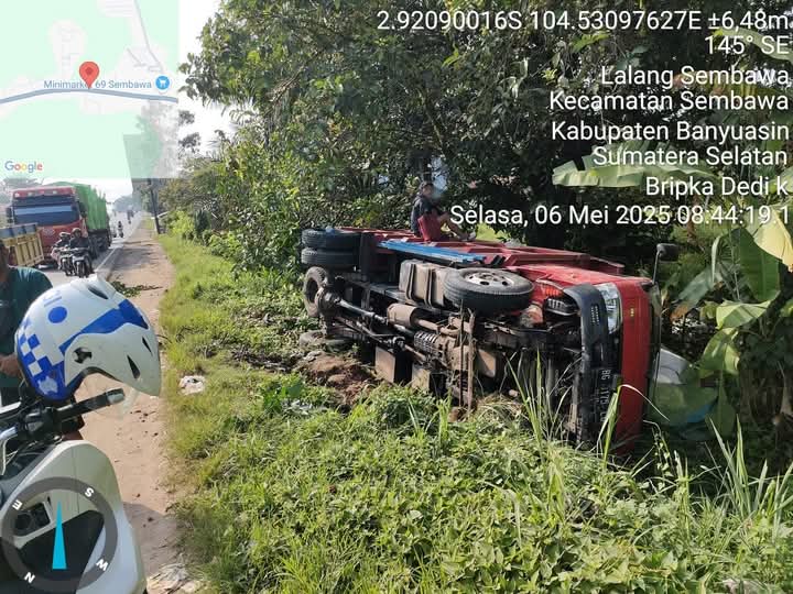 truck tersebut membanting stir karena menghindari kendaraan yang menyalip dari arah berlawanan sehingga menyebabkan kendaraan tersebut terperosok dan terguling, Selasa (6/5).