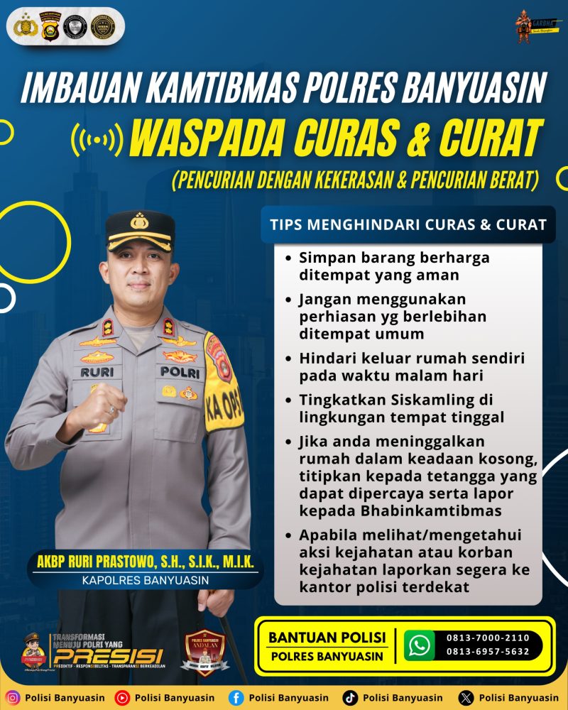 BANYUASIN,inewsnusantara.com,- Polres Banyuasin, Polda Sumsel, menghimbau masyarakat untuk meningkatkan kewaspadaan terhadap aksi kejahatan seperti pencurian dengan kekerasan (Curas), pencurian dengan pemberatan (Curat), dan pencurian kendaraan bermotor (Curanmor).