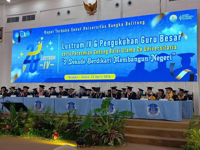 Bangka Belitung, INC,. — Momentum Lustrum IV Universitas Bangka Belitung (UBB) menjadi panggung penting penguatan akademik. Dalam Rapat Terbuka Senat yang digelar di Balun Ijuk, Kabupaten Bangka, Senin (13/4/2026), UBB resmi mengukuhkan tiga dosen sebagai guru besar sekaligus meresmikan Gedung Balai Utama De Universitaria.