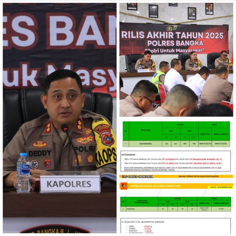 Kapolres Bangka, AKBP Deddy Dwitiya Putra, mengungkapkan kasus narkotika pada 2025 naik 9 kasus dari tahun sebelumnya, dengan persentase 25,6 persen.