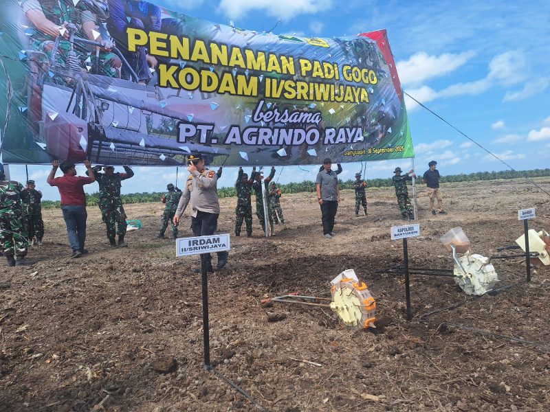 BANYUASIN,inewsnusantara.com,– Guna mendorong ketahanan pangan di wilayah Sumatera Selatan, Panglima Kodam II/Sriwijaya memimpin secara langsung kegiatan penanaman padi gogo secara simbolis di lahan PT Agrindo Raya, Desa Pematang Palas, Kecamatan Banyuasin I, Kamis (18/9).