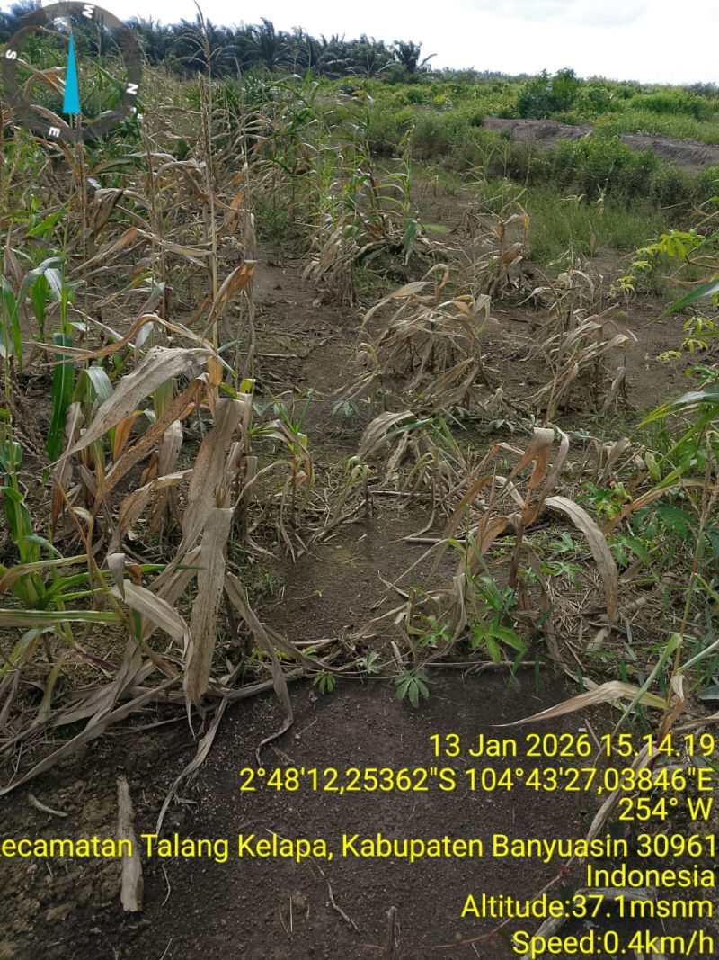 BANYUASIN –INC, -Sebagai wujud nyata dukungan terhadap program ketahanan pangan pemerintah, Bhabinkamtibmas Polsek Talang Kelapa, Brigpol Hartadi Ade K, melaksanakan kegiatan pengecekan dan perawatan tanaman jagung di lahan pertanian, Selasa (13/1) sore.