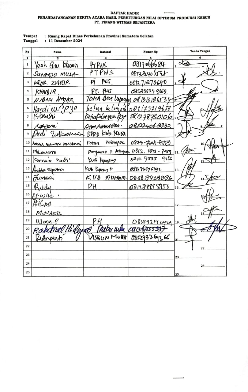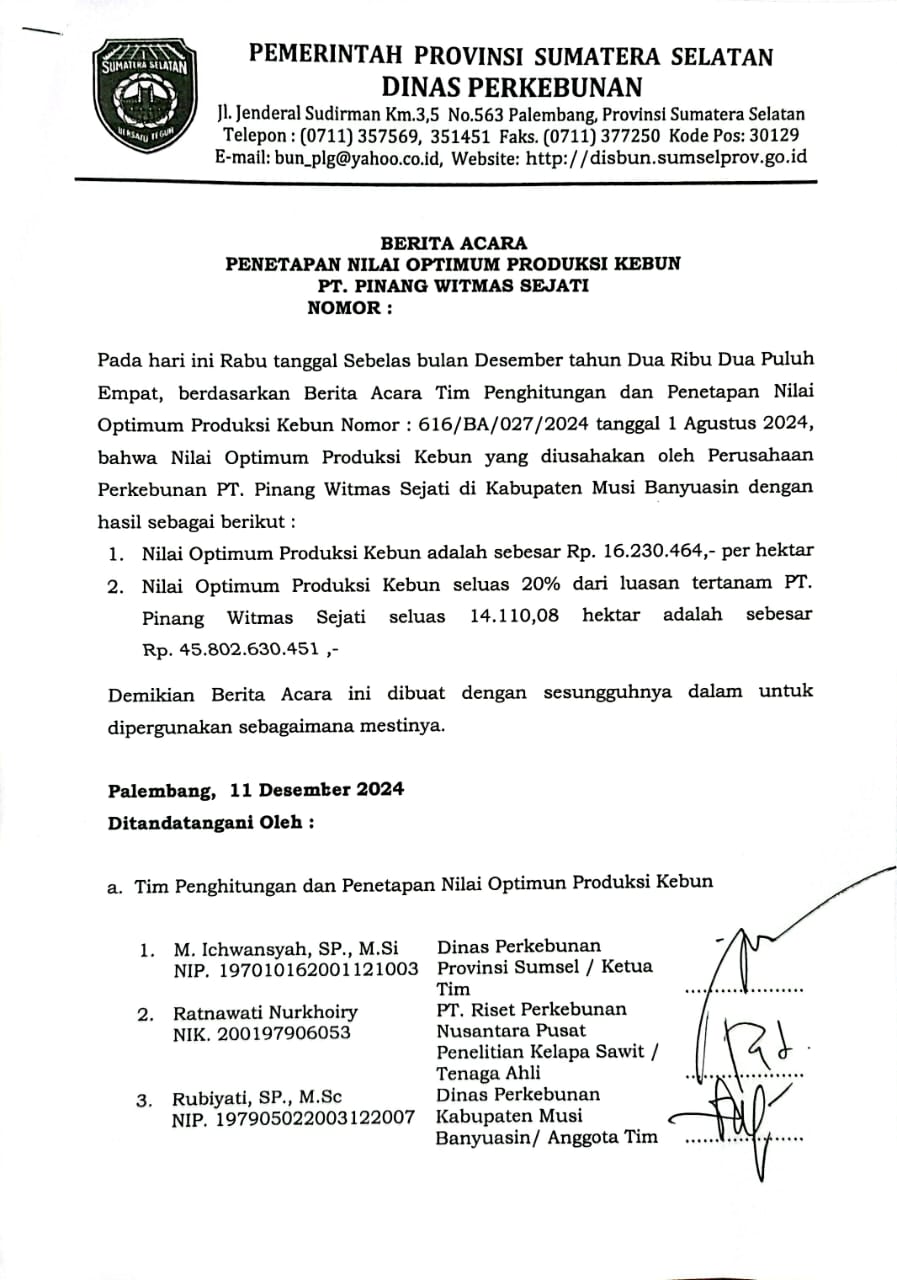 Rapat dengan agenda Penandatanganan Berita Acara Penetapan Nilai Optimum Produksi Kebun PT Pinang Witmas Sejati, berdasarkan Tim Penghitungan dan Penetapan Nilai Optimum Produksi Kebun oleh M Ichwansyah SP MSi dari Dinas Perkebunan Provinsi Sumsel sekaligus Ketua Tim, Ratnawati Nurkhoiry, selaku PT Riset Perkebunan Nusantara Pusat Penelitian Kelapa Sawit sekaligus tenaga ahli, Rubiyati SP MSc dari Dinas Pekerbunan Kabupaten Musi Banyuasin sekaligus anggota tim, sesuai Berita Acara Tim Penghitungan dan Penetapan Nilai Optimum Produksi Kebun Nomor : 616/BA/027/20204 tanggal 1 Agustus 2024, bahwa Nilai Optimum Produksi Kebun yang diusahakan oleh Perusahaan Pekebunan PT Pinang Witmas Sejati di Kabupaten Musi Banyuasin dengan hasil sebagai berikut :