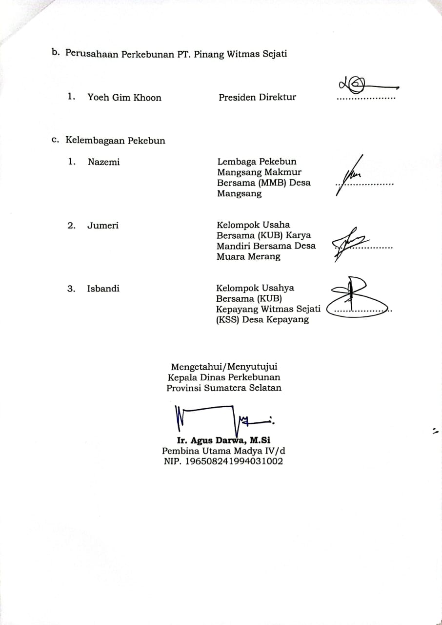 Dalam rangka untuk melaksanakan ketentuan Keputusan Direktur Jenderal Perkebunan Nomor :152.Kpts/HK.160/12/2023 telah dilakukan rapat di ruang rapat Kantor Dinas Perkebunan Provinsi Sumatera Selatan, pada hari Rabu 11 Desember 2024, dipimpin langsung oleh Kepala Dinas Perkebunan Provinsi Sumatera Selatan Ir Agus Darwa MSi, dengan dihadiri langsung oleh Presiden Direktur PT Pinang Witmas Sejati Bapak Yeoh Gim Khoon beserta Bapak Sunarjo Musa, Khaidir, Meor Zuheir. Kemudian dihadiri juga Bapak Isbandi selaku Ketua Kelompok Usaha Bersama (KUB) Kepayang Witmas Sejati (KSS) Desa Kepayang, Jumeri selaku Ketua Kelompok Usaha Bersama (KUB) Karya Mandiri Bersama Desa Muara Merang, dan Nazemi selaku Ketua Lembaga Pekebun Mangsang Makmur Bersama (MMB) Desa Mangsang, dan dihadiri tokoh Masyarakat Bapak H. Ibnu Hajar, Andika, Kurnain Hadi, M. Nasir, Erwin, Hendi Wijaya juga beberapa Masyarakat dari 3 (tiga) desa yakni Desa Kepayang, Desa Muara Merang dan Desa Mangsang