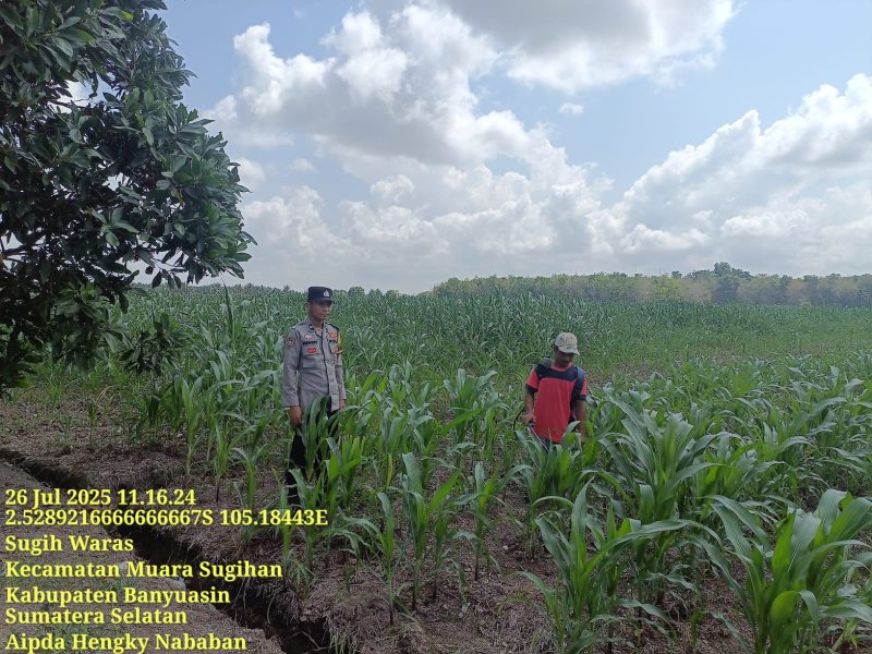 BANYUASIN,inewsnusantara.com,- Bhabinkamtibmas Polsek Muara Padang Polsubsektor Muara Sugihan Aipda Hengky Pandapotan, SH melaksanakan giat pengecekan dan peninjauan lahan Jagung sekaligus m memberikan Sosialisasi Harga Jagung, Sabtu (26/7).