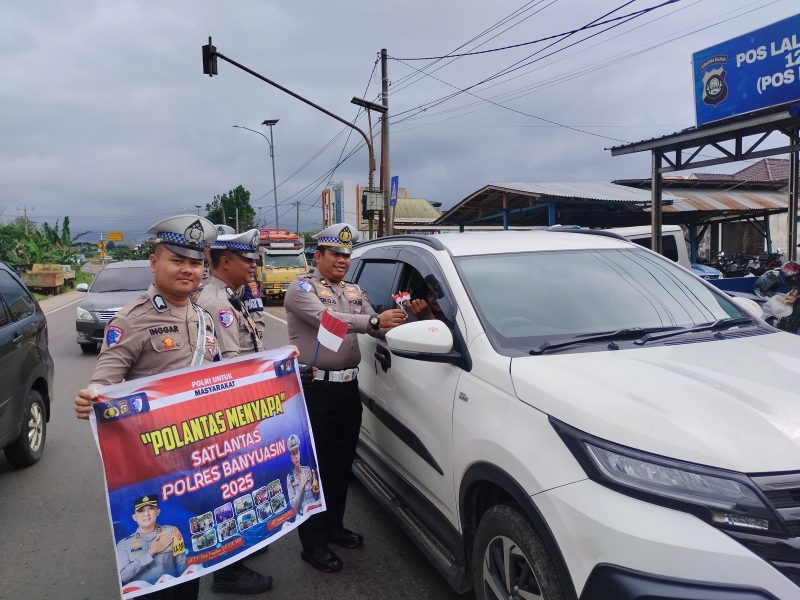 Satlantas Polres Banyuasin Pasang Bendera Merah Putih Pada Kendaraan dan Bentangkan Spanduk Polantas Menyapa