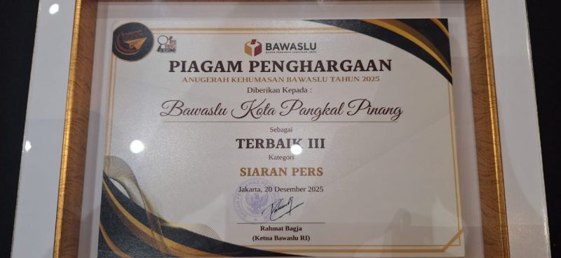 Jakarta, INC. – Bawaslu Kota Pangkalpinang kembali menorehkan prestasi membanggakan di tingkat nasional. Kali ini, lembaga pengawas pemilu tersebut berhasil meraih penghargaan Terbaik 3 kategori Siaran Pers dalam Anugerah Kehumasan Bawaslu Tahun 2025 yang digelar di Jakarta, Sabtu (20/12/2025).
